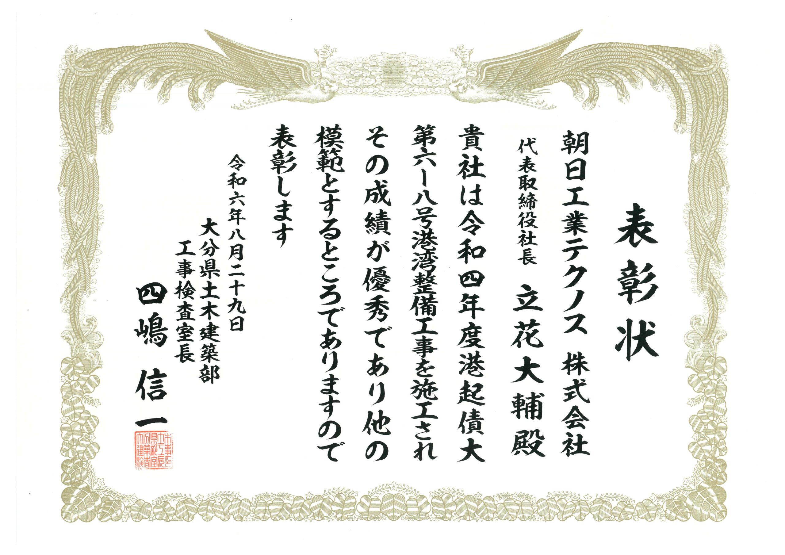 令和6年度優良建設工事表彰(工事検査室長表彰)について、令和4年度港起債大第6-8号港湾整備工事 が表彰されました。